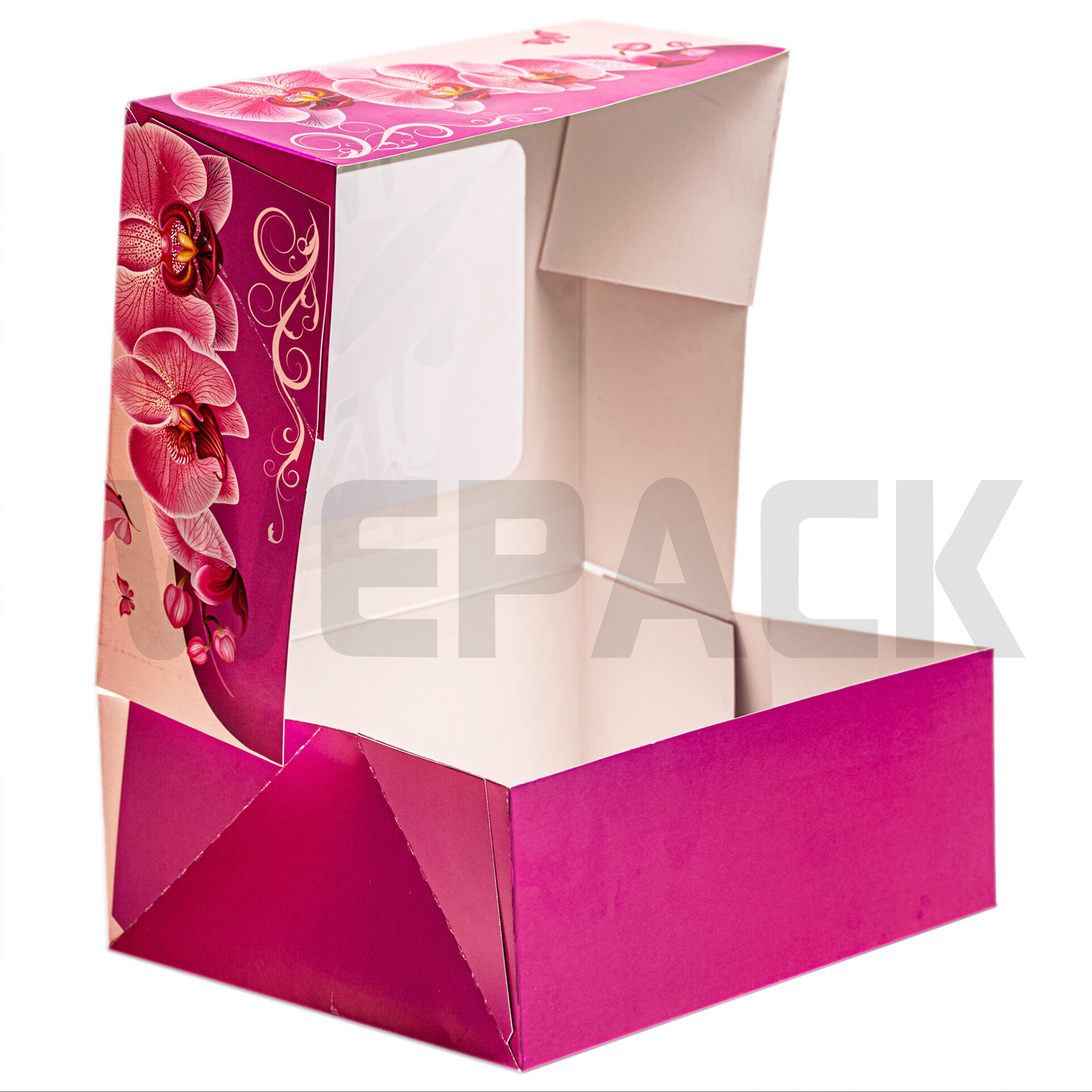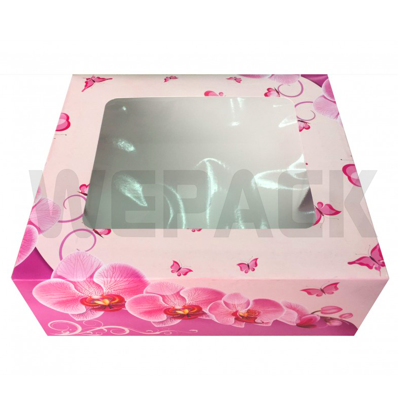 Cutie confectionata din carton cu design floral deosebit este prevazuta cu fereastra.