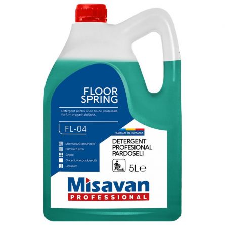 Detergentul profesional pentru pardoseli Misavan Professional Floor Spring curata orice tip de pardoseala - parchet, gresie, linoleum, granit, marmura, mozaic, piatra.