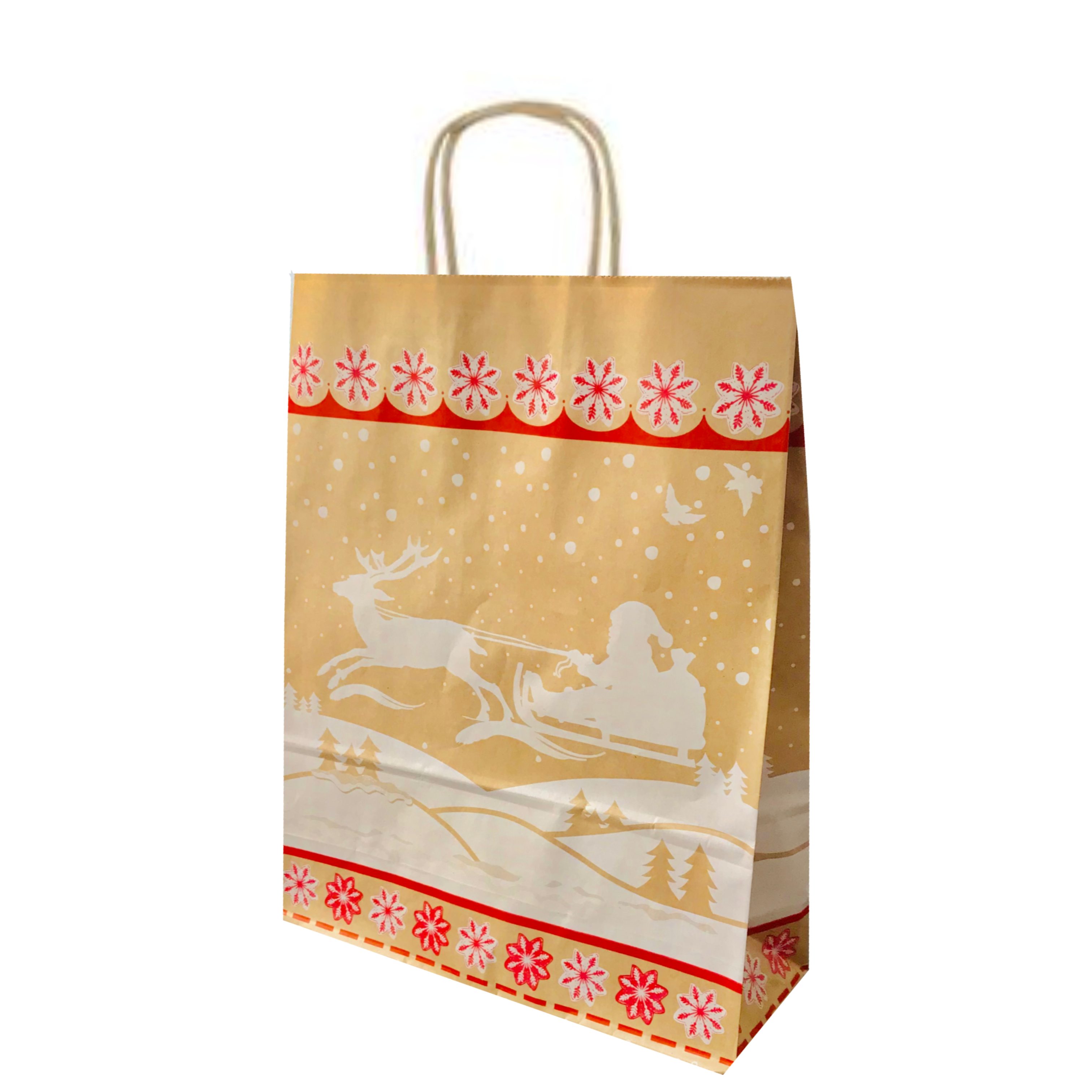 Sacosa cu model saniuta lui Mos Craciun este o sacosa realizata din hartie kraft, in culoare natur, si este disponibila in dimensiune de 25 x 14 x 30 cm. Acest produs este ambalat in cutii a cate 100 bucati per cutie, si are o densitate a materialului de 90gr/ mp. Densitatea materialului folosit ofera o siguranta sporita pentru bunurile oferite in aceste sacosi.
